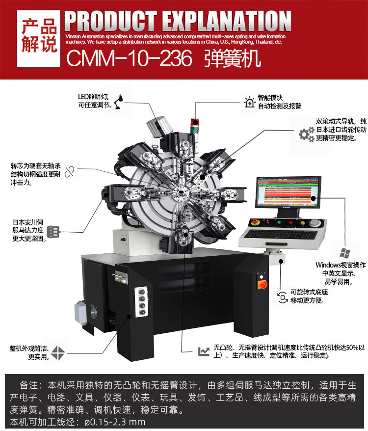 • 產品概述: CMM-10-236電腦彈簧機 可生產?0.15-2.3 mm線徑彈簧及線成形等)本機采用獨特的無凸輪和無搖臂設計,由多組伺服馬達獨立控制,可以生產各種各樣異型彈簧、壓簧、雙扭簧、電池簧、扁簧(發(fā)條簧)及各種線成型等。精密準確、調機快速、穩(wěn)定可靠。