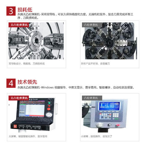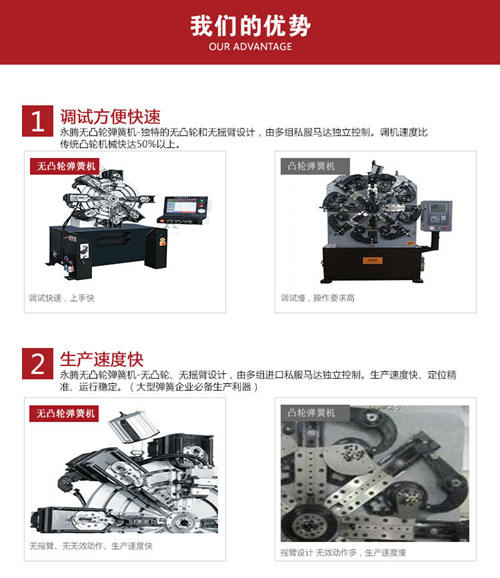 在近幾年無凸輪彈簧機逐漸得到彈簧生產廠家的認可。與傳統(tǒng)帶凸輪彈簧機相比,永騰無凸輪彈簧機在設計上采用獨特