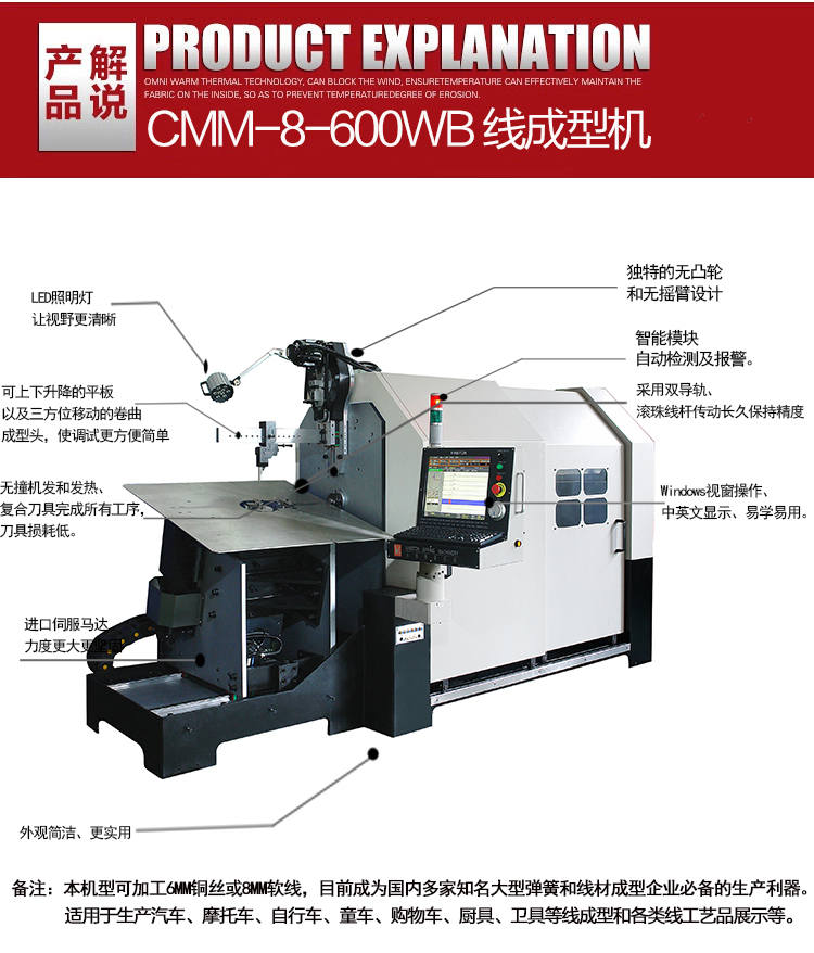 此次參展,東莞永騰自動化設備有限公司帶來的設備有CMM-8-600WB八軸多功能線材成型機、CMM-12-236R轉線機、CMM-12-450R轉線機,其中CMM-8-600WB八軸多功能線材成型機為此次展品的重頭戲。本機全部采用雙導軌滾珠絲桿傳動,以保證精度和力度。它可以加工4毫米鋼絲或6毫米軟線,目前成為國內多家知名大型彈簧和線材成型企業(yè)必備的生產利器。無撞機發(fā)和發(fā)熱、復合刀具完成所有工序,刀具損耗低。智能模塊,還可以自動檢測及報警。Windows視窗操作、中英文顯示、易學易用。該設備適用生產汽車,摩托車,自行車,童車,購物車,廚具以及各類線成型工藝品展示架等。