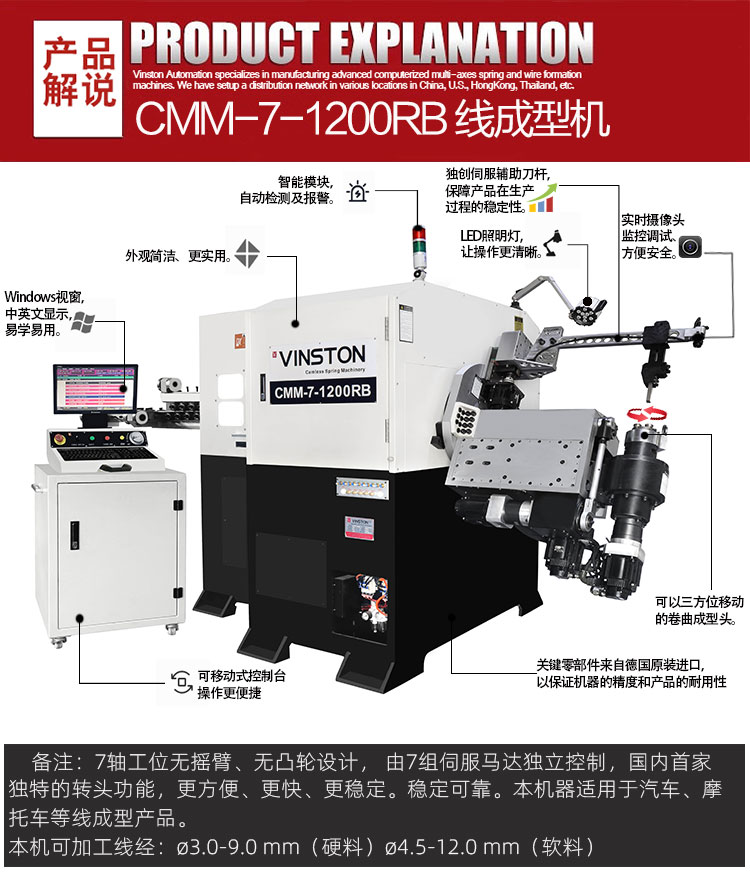 • 產(chǎn)品概述: CMM-7-1200RB線材成型機(jī)可生產(chǎn) ?3.0-9.0 mm線經(jīng),鐵線或者低碳鋼可做?4.5-12.0 mm線經(jīng)線成型),本機(jī)專(zhuān)業(yè)生產(chǎn)汽車(chē)零部件等線成型,特別適合做大桿件汽車(chē)五金線材成型產(chǎn)品7軸工位無(wú)搖臂、無(wú)凸輪設(shè)計(jì), 由7組伺服馬達(dá)獨(dú)立控制,國(guó)內(nèi)首家獨(dú)特的轉(zhuǎn)頭功能,更方便、更快、更穩(wěn)定。穩(wěn)定可靠。
