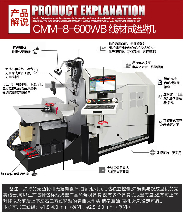 特別說明:本機(jī)重點為衛(wèi)廚五金行業(yè)量身打造。除此外,還適用于汽車、摩托車、自行車等及娛樂健身器材所需的高精密彈簧及線成型的生產(chǎn)。