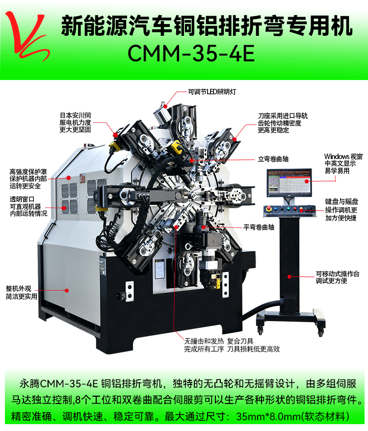• 產(chǎn)品概述: CMM-35-4E銅排折彎?rùn)C(jī)(最大通過(guò)尺寸:35mm*8.0mm)集3D折彎?rùn)C(jī)和彈簧機(jī)所有的功能于一體的多功能專(zhuān)用機(jī),本機(jī)采用獨(dú)特的無(wú)凸輪和無(wú)搖臂設(shè)計(jì),由多組伺服馬達(dá)獨(dú)立控制,永騰銅排折彎?rùn)C(jī)廣泛應(yīng)用于導(dǎo)電排成型,新能源電池連接排、新能源電池模組、銅母排成型、硬排成型、導(dǎo)電排、電池連接排、銅排、裸排成型等。精密準(zhǔn)確、調(diào)機(jī)快速、穩(wěn)定可靠。