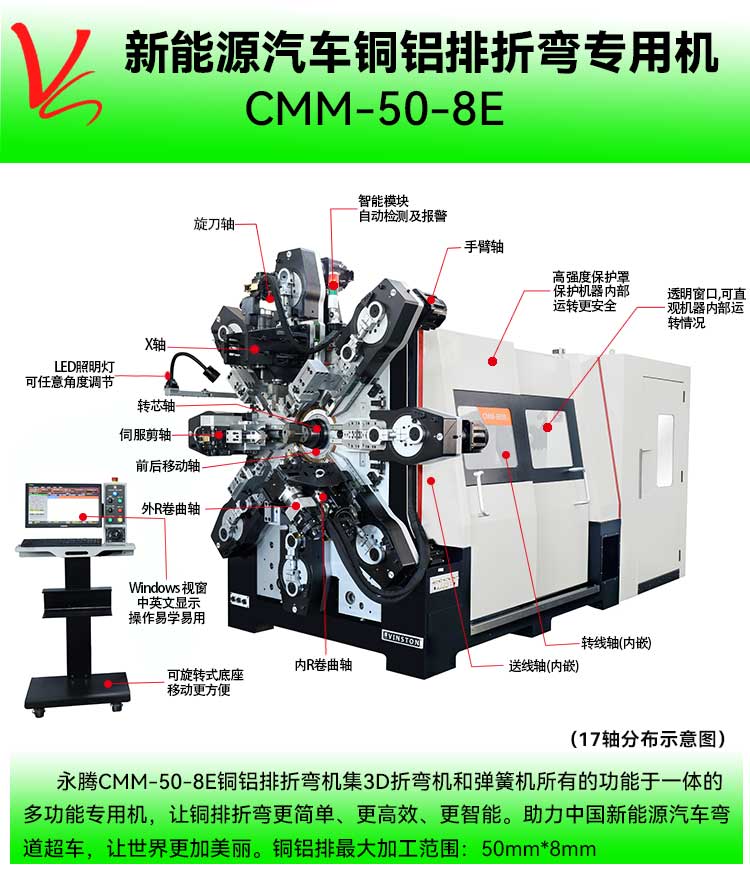 - 產(chǎn)品概述: CMM-50-8E銅排折彎機(最大通過尺寸:50mm*8.0mm)集3D折彎機和彈簧機所有的功能于一體的多功能專用機,本機采用獨特的無凸輪和無搖臂設(shè)計,由多組伺服馬達獨立控制,永騰銅排折彎機廣泛應(yīng)用于導(dǎo)電排成型,新能源電池連接排、新能源電池模組、銅母排成型、硬排成型、導(dǎo)電排、電池連接排、銅排、裸排成型等。精密準確、調(diào)機快速、穩(wěn)定可靠。